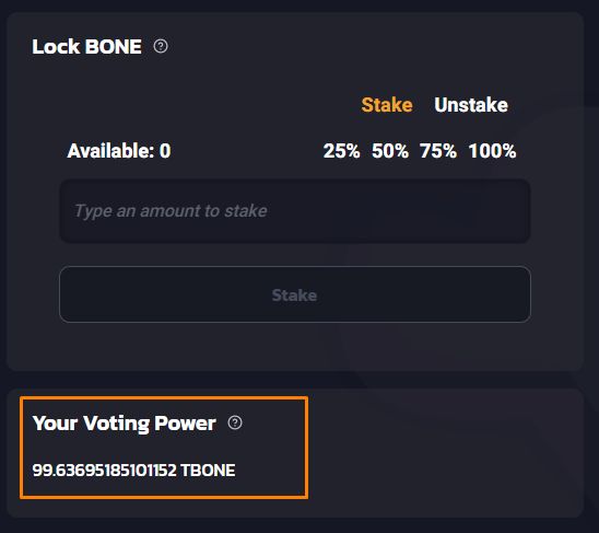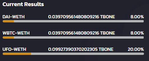 A 'Current Results' screen is displayed as well for a transparent yet effective way of tracking the voting power. Pair, amount of TBONE weighing-in, and percentage information are displayed throughout the process.