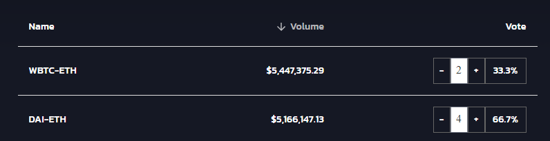 As you enter the Active grouping of pairs, you will be able to see the Name of the listed pairs, Volume information, and a voting entry system, in which you can type in or click on the icons to navigate. Percentages of the 'Vote Split' will be shown next to the selected pairs.