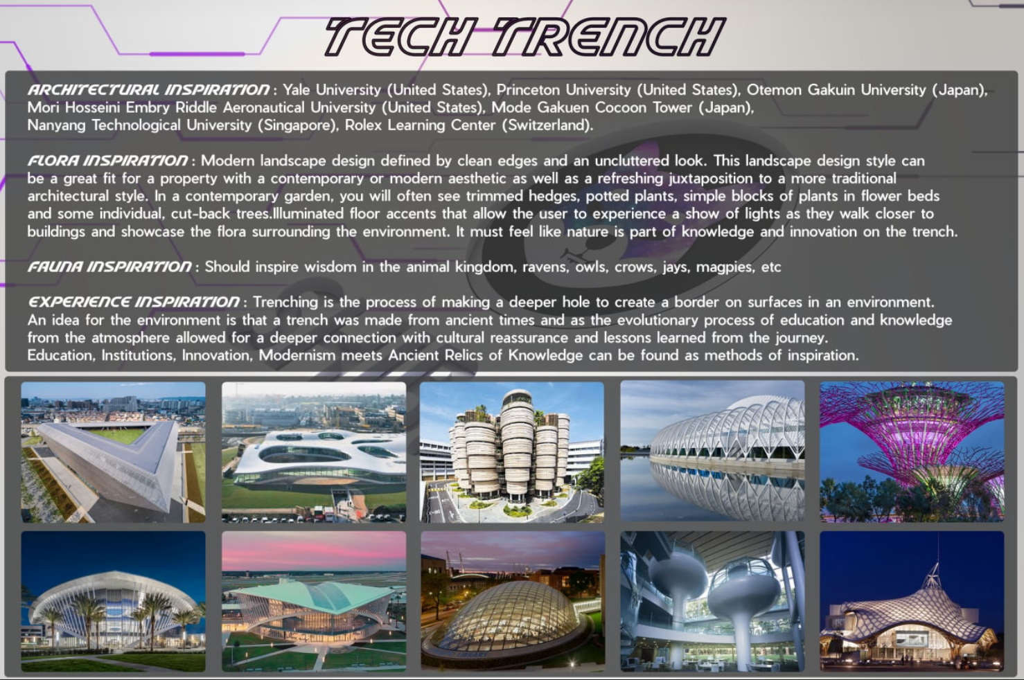 The idea for the Tech Trench environment is that of an immersive trench that was made from ancient times, and yet has evolved to a hyper technological avenue, due to its course process of education and knowledge from the millions of community members that embraced the atmosphere in a way of futuristic modernism and marvels alike.